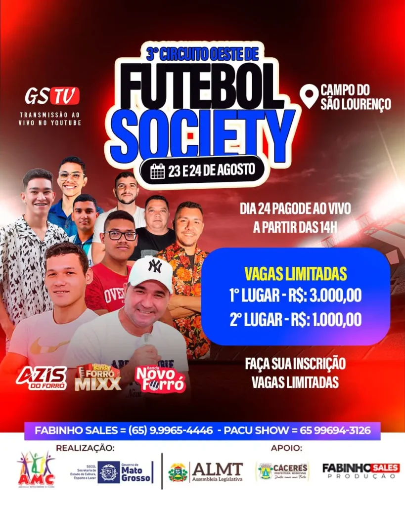 O fim de semana de 23 e 24 de agosto será de muita festa e futebol em Cáceres. O 3º Circuito Oeste de Futebol Society vai reunir equipes da região no Campo do São Lourenço para disputar uma premiação total de R$ 4 mil. O evento busca valorizar o esporte amador e oferecer entretenimento de qualidade para toda a comunidade.