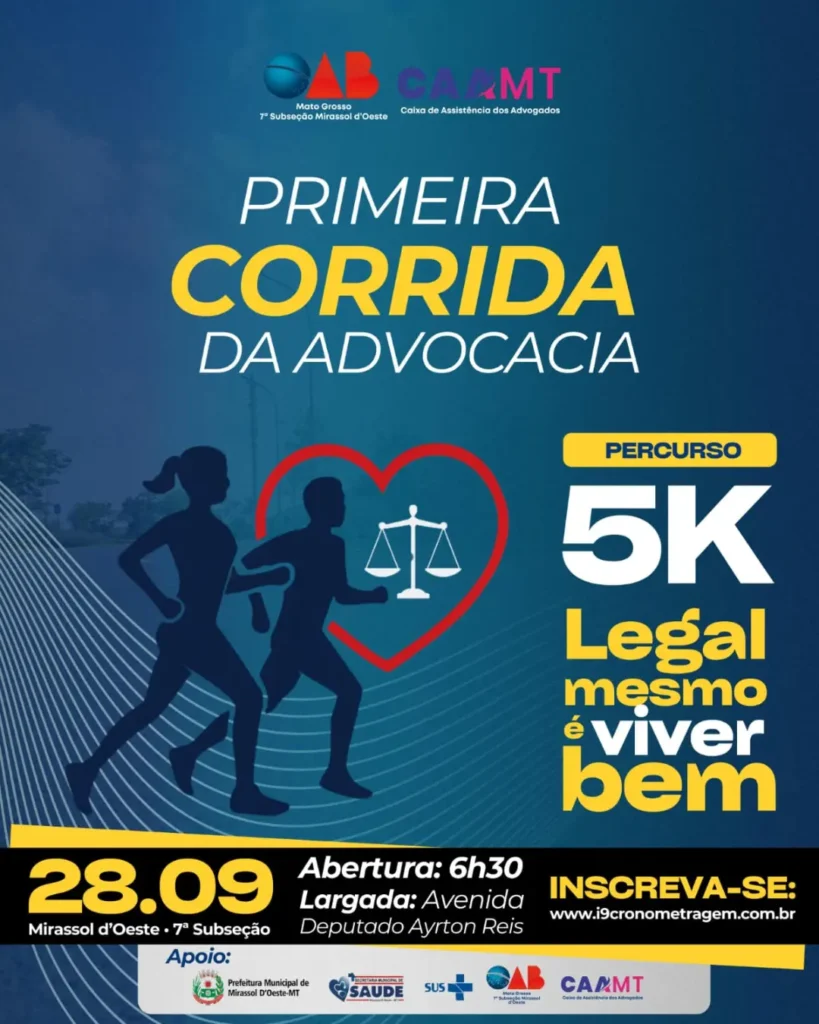 Com o lema “Legal mesmo é viver bem”, a corrida é aberta ao público em geral. A iniciativa valoriza o esporte amador e a participação da comunidade, destacando o compromisso da OAB com o bem-estar de toda a população da região de Mirassol d’Oeste.